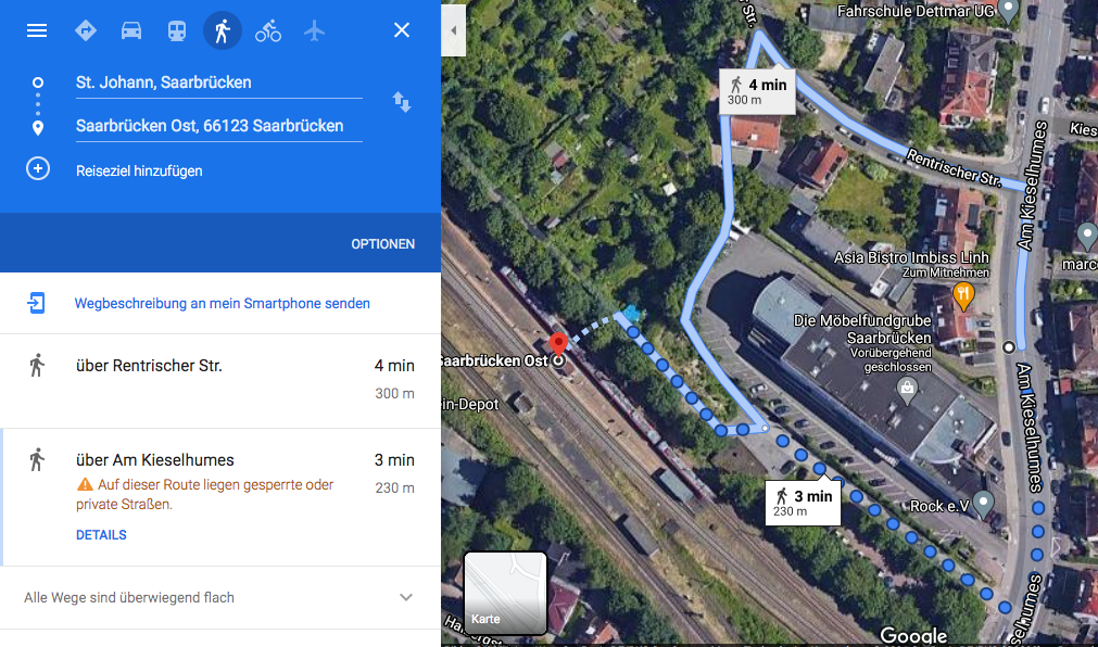 The path to the Ostbahnhof is between the Möbelfundgrube and a snack bar along a car park. The station has only been used by regional trains since 2014/2015. There are two tracks: Track 1 faces the direction of Saarbrücken Hauptbahnhof; Track 2 runs in the direction of St. Ingbert. The access to tracks 3 and 4 is closed and has been shut down for passenger traffic since 1997. The building with the stairway to tracks 1 and 2 has existed since 1960 and has not been renovated since, so it is no longer in good condition and has a lot of graffiti. In the evening, the station is rather dimly lit. Access to the tracks is only possible via a long staircase and is therefore not barrier-free. There is a ticket machine and roofed seating. The station is not very hygienic or clean. The Ostbahnhof Saarbrücken is frequented by three different regional train lines: RB 68, RB 70 and RB 71. All three lines lead to the main station and away from the main station via the Ostbahnhof in the direction of St. Ingbert. The trains leave the station every half hour in both directions. The first train towards Saarbrücken arrives at 5:07 am and the last at 1:10 am. It takes 3-4 minutes to get to Saarbrücken. Trains in the direction of St. Ingbert leave between 5:19 in the morning and 1:10 at night.