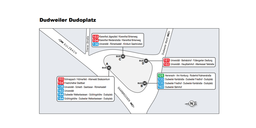 Insgesamt befinden sich am Dudoplatz vier Haltestellen die von der SaarVV befahren werden. Folgende Buslinien werden an den Bussteigen angefahren: